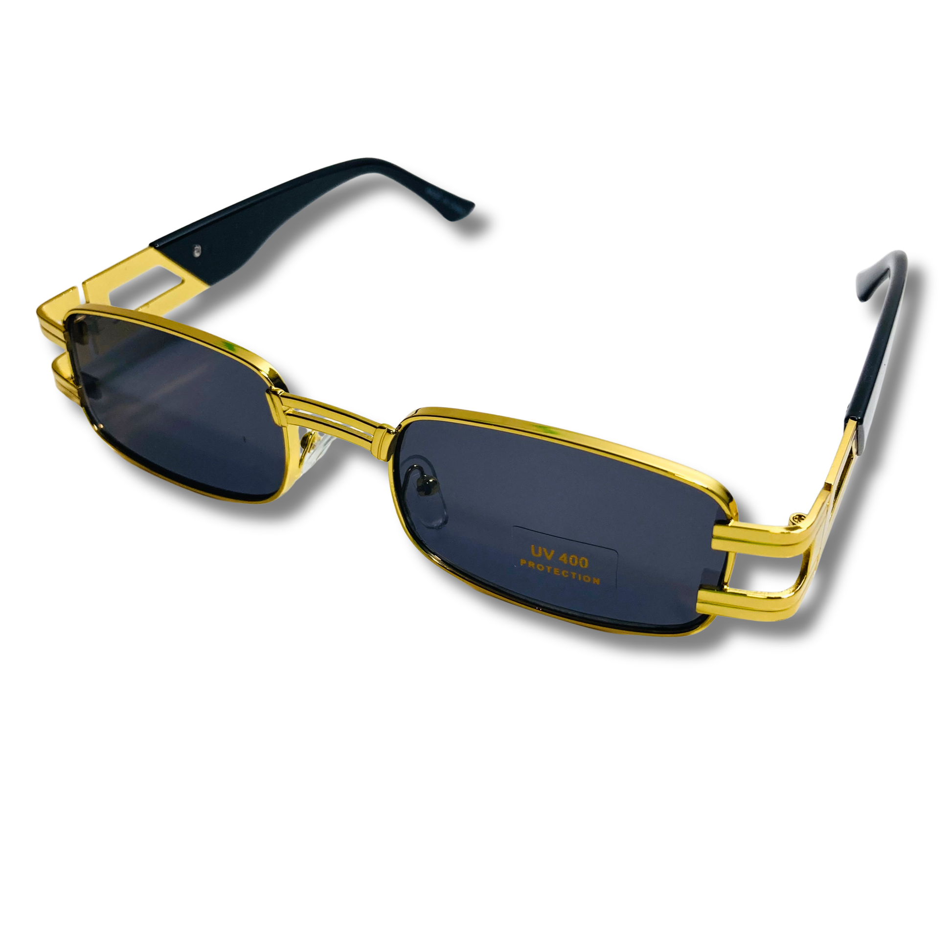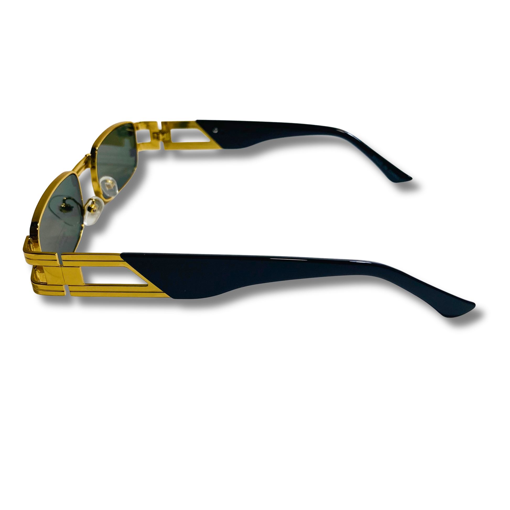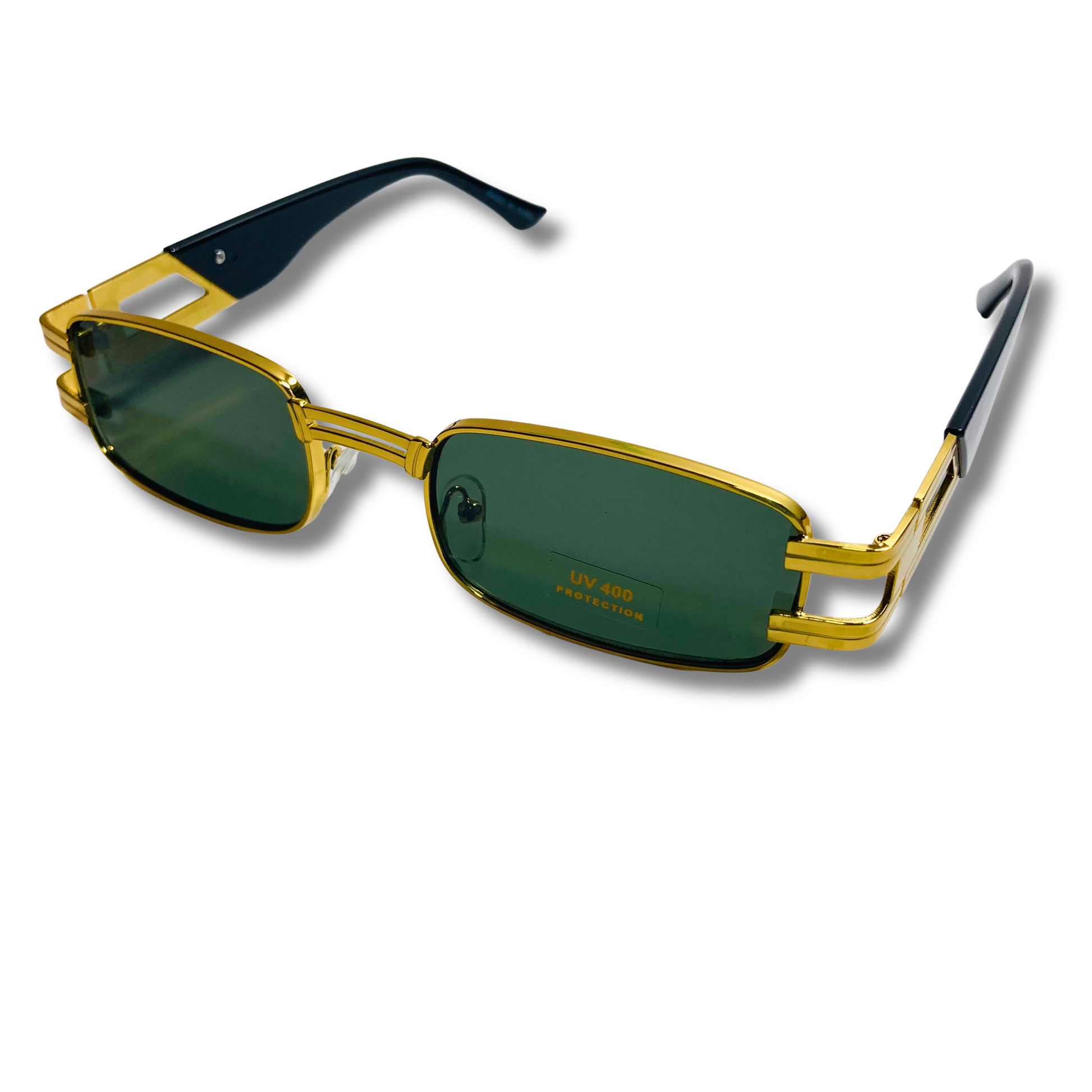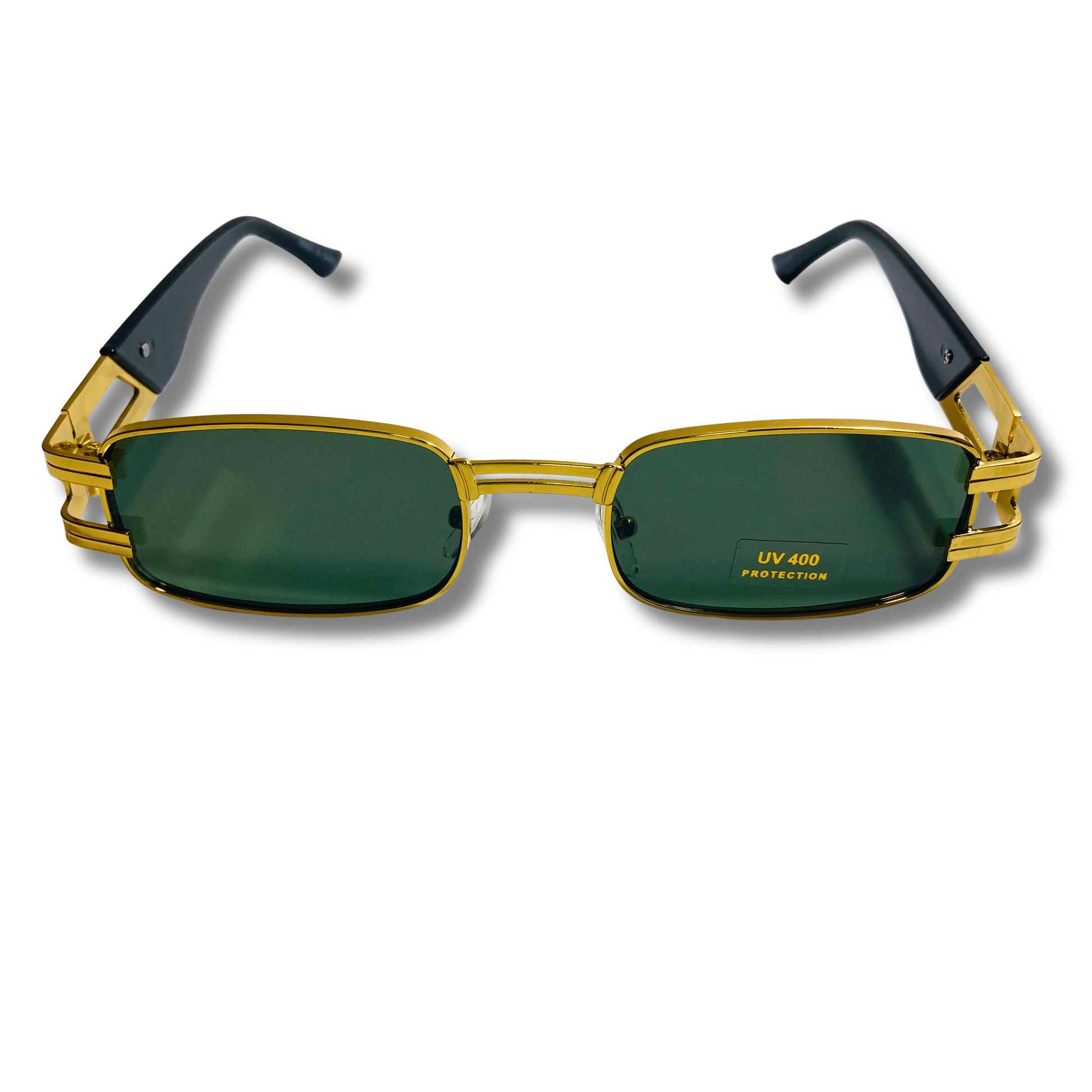 Heavyweight style in a slender package. The Badieux features a heavyweight metal frame with cut-out accents that house a pair of polycarbonate lenses in a sleek, low profile, rectangular silhouette. These gold sunglasses are the epitome of understated decadence. Available in four colors: gold/green, gold/brown, gold/black, and gold/clear.