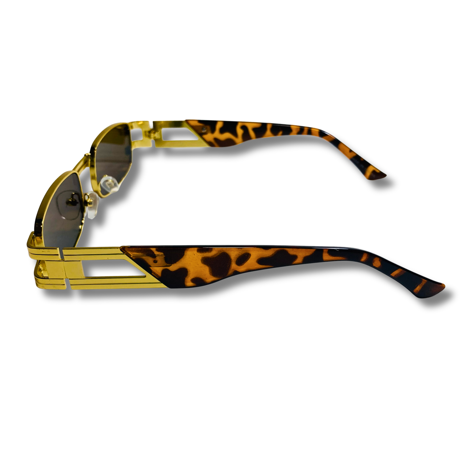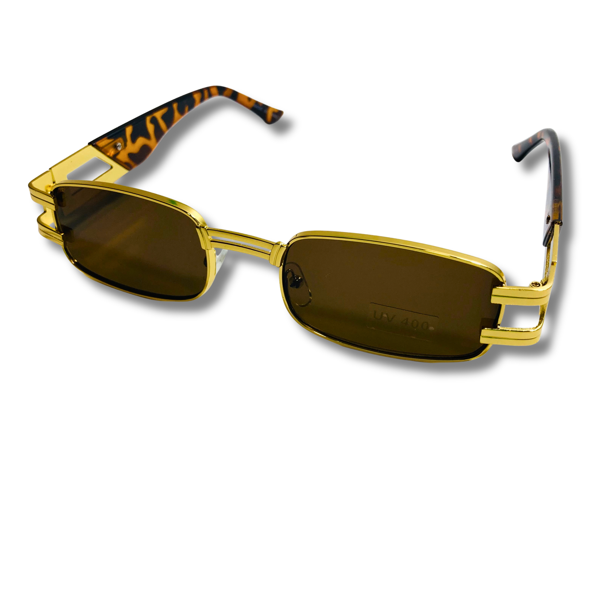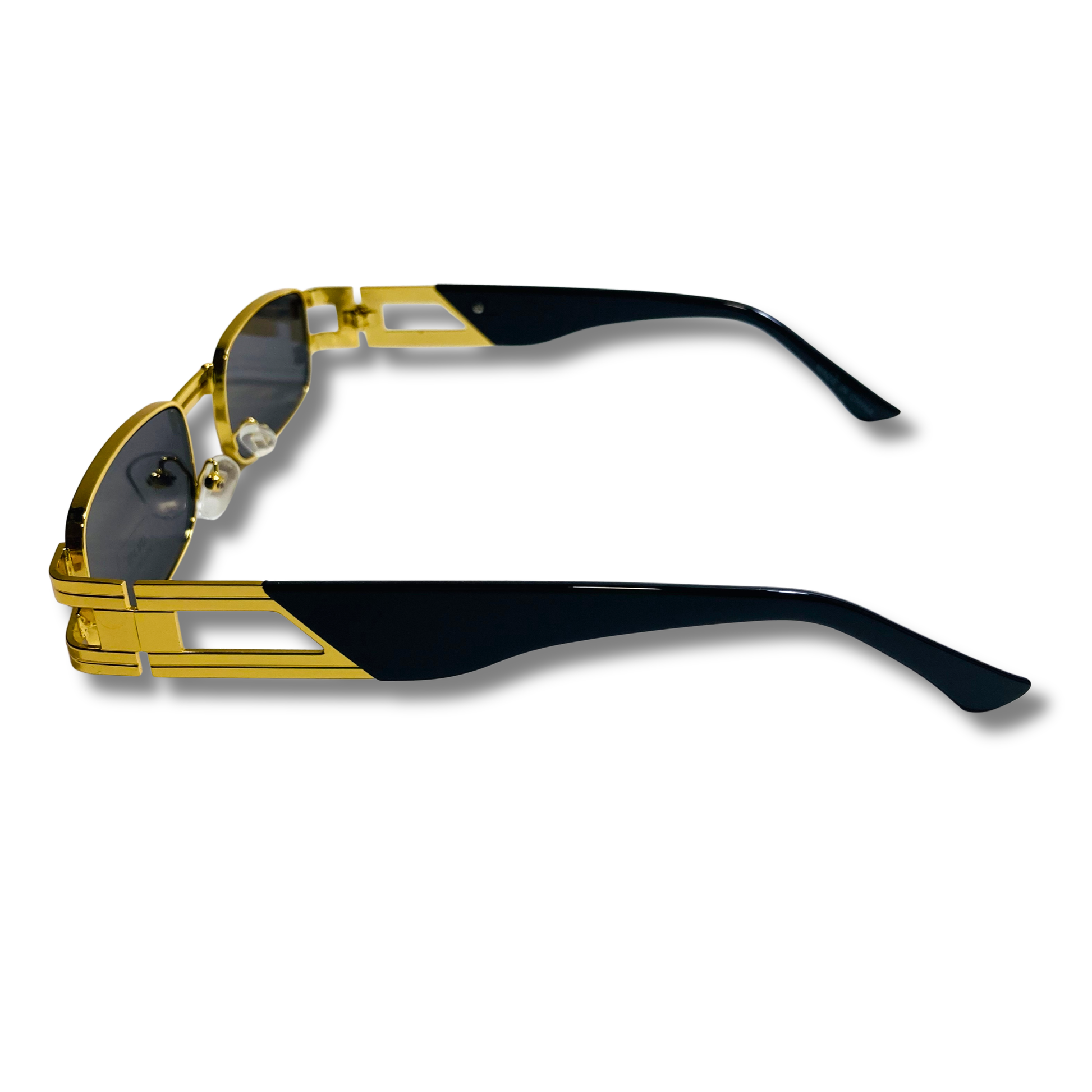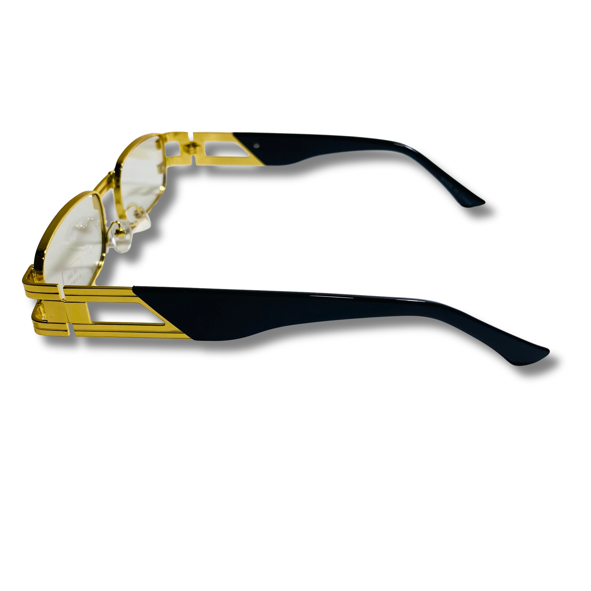 Heavyweight style in a slender package. The Badieux features a heavyweight metal frame with cut-out accents that house a pair of polycarbonate lenses in a sleek, low profile, rectangular silhouette. These gold sunglasses are the epitome of understated decadence. Available in four colors: gold/green, gold/brown, gold/black, and gold/clear.