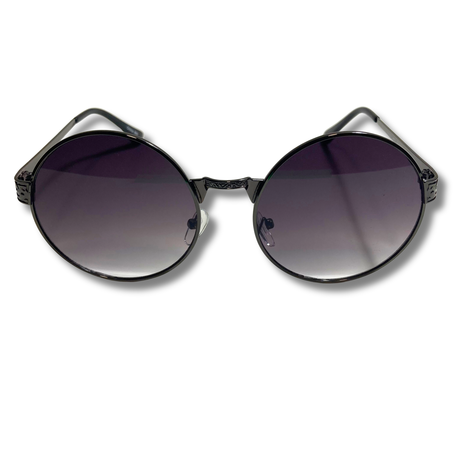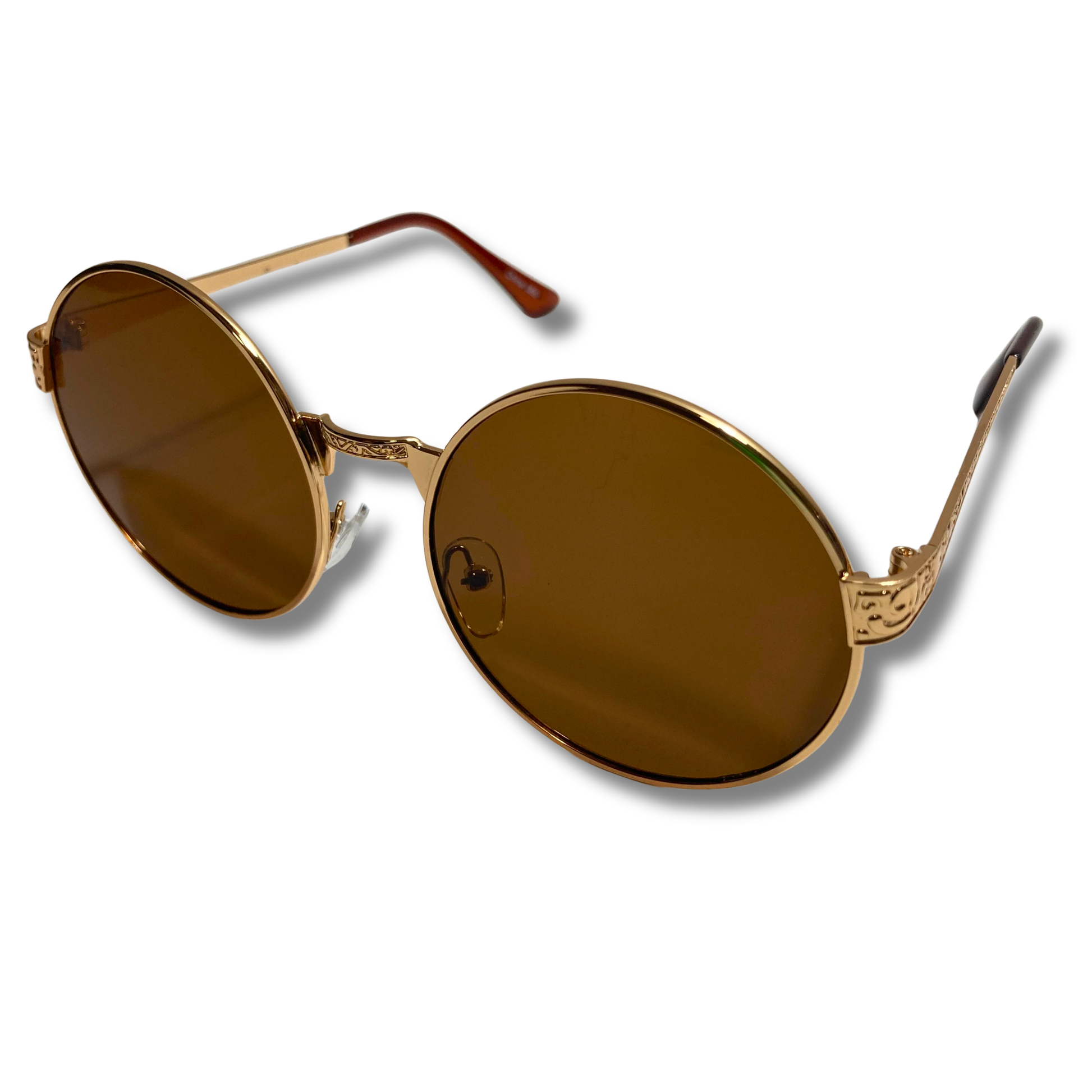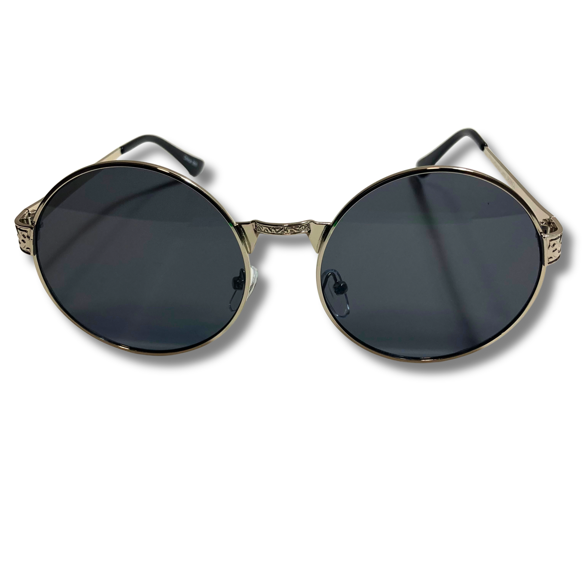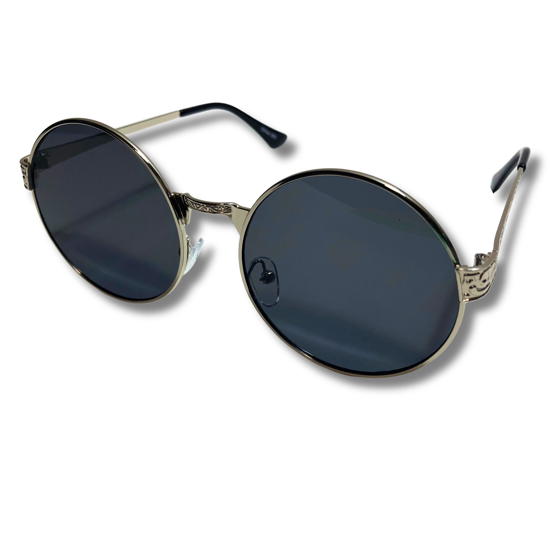 Around and around and around we go. Circular sunglasses are without a doubt the most popular silhouette in popular culture at the moment. The Benjo perfectly embody this trend, these larger size round sunglasses feature an engraved frame that adds classic victorian styling to an ultra-modern pair of sunglasses. Available in three colors: gold/brown, black, and silver/black.