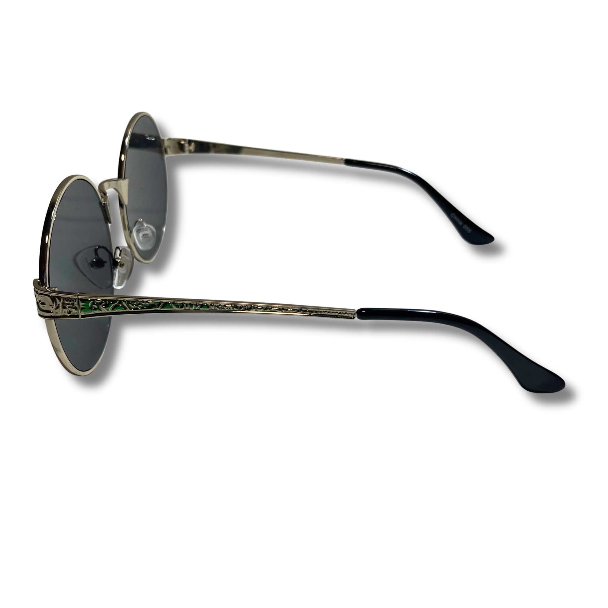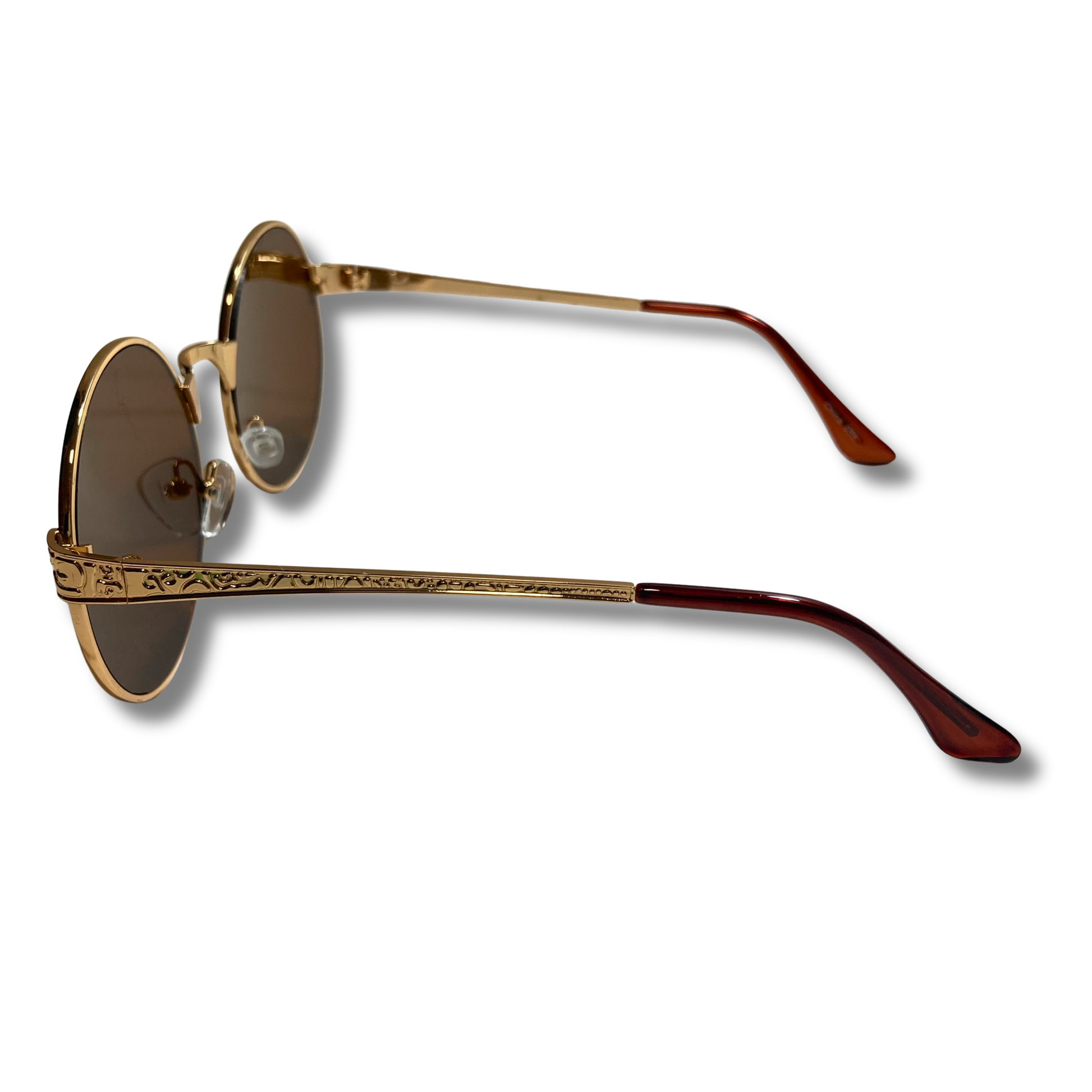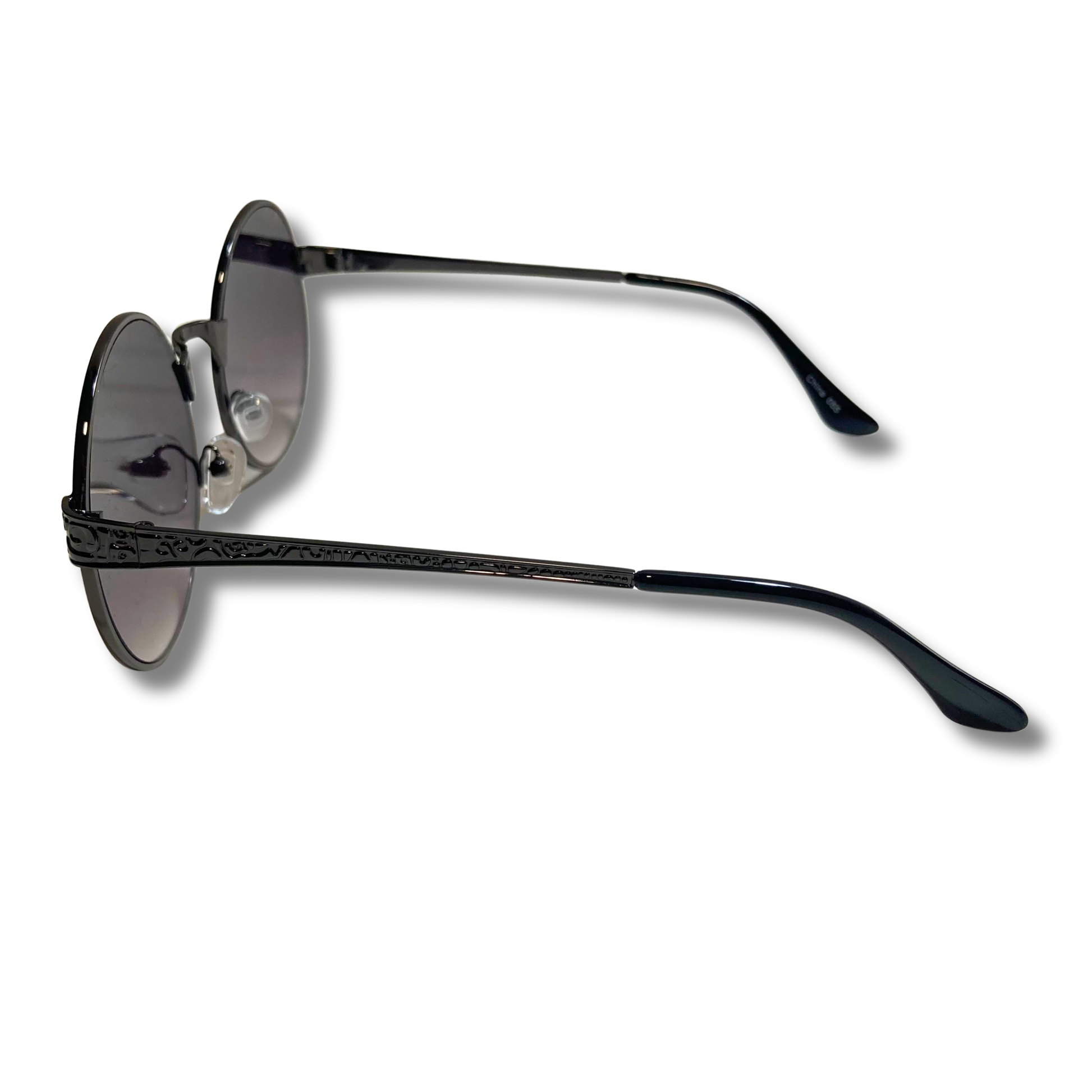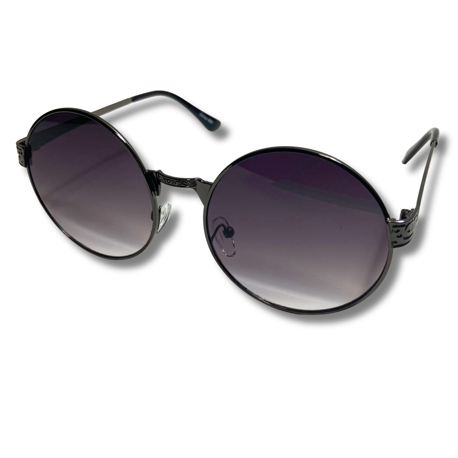 Around and around and around we go. Circular sunglasses are without a doubt the most popular silhouette in popular culture at the moment. The Benjo perfectly embody this trend, these larger size round sunglasses feature an engraved frame that adds classic victorian styling to an ultra-modern pair of sunglasses. Available in three colors: gold/brown, black, and silver/black.