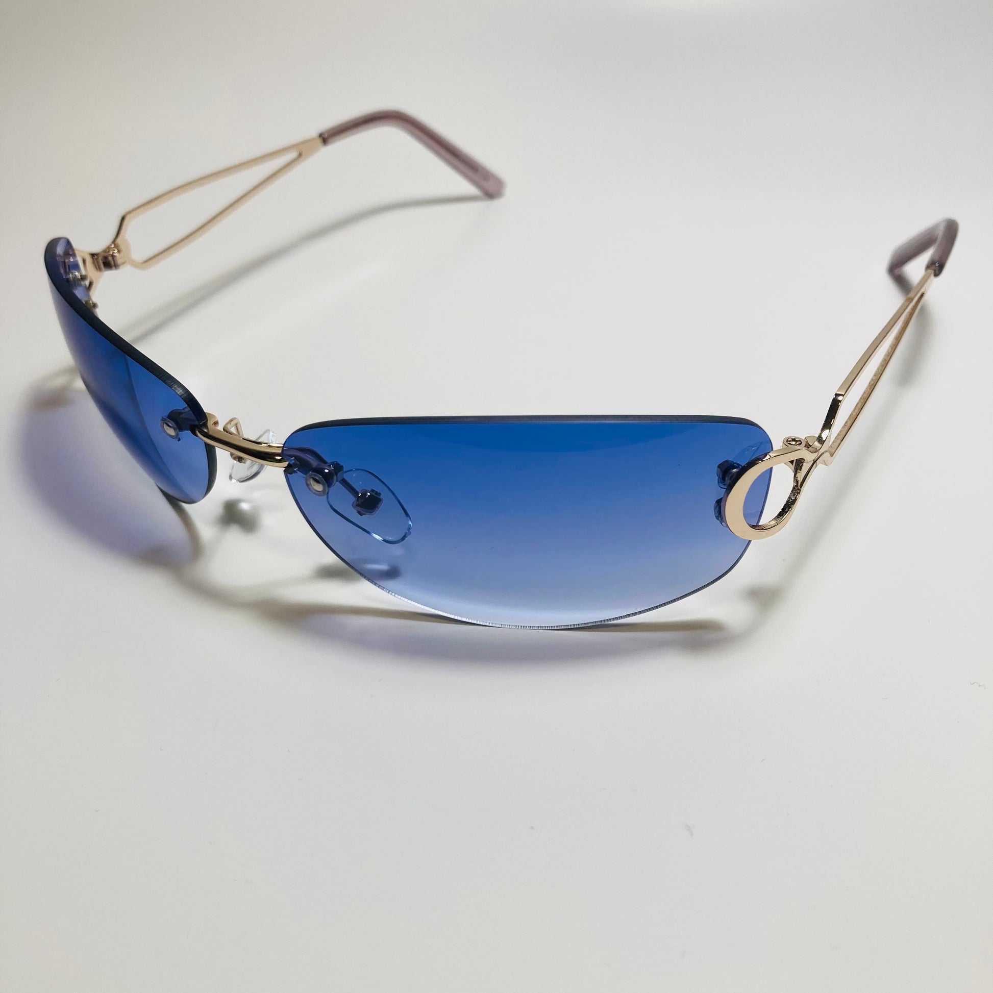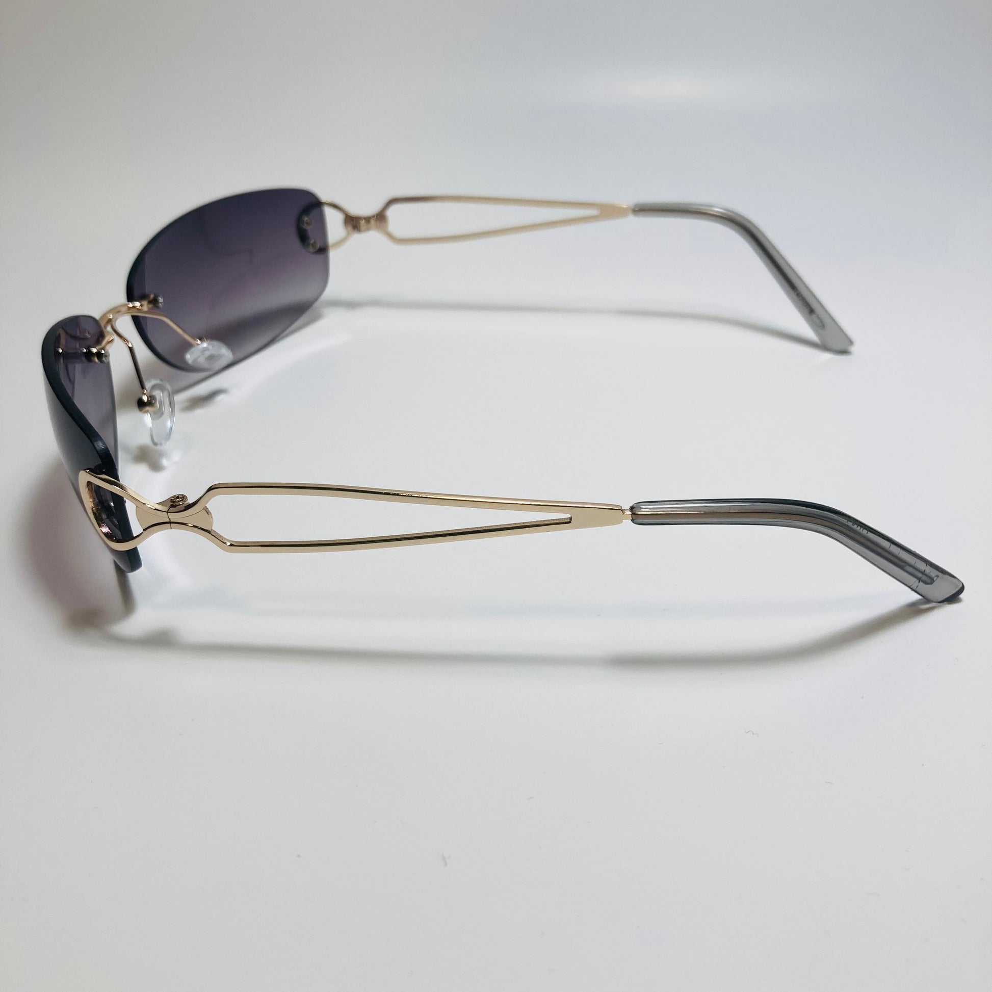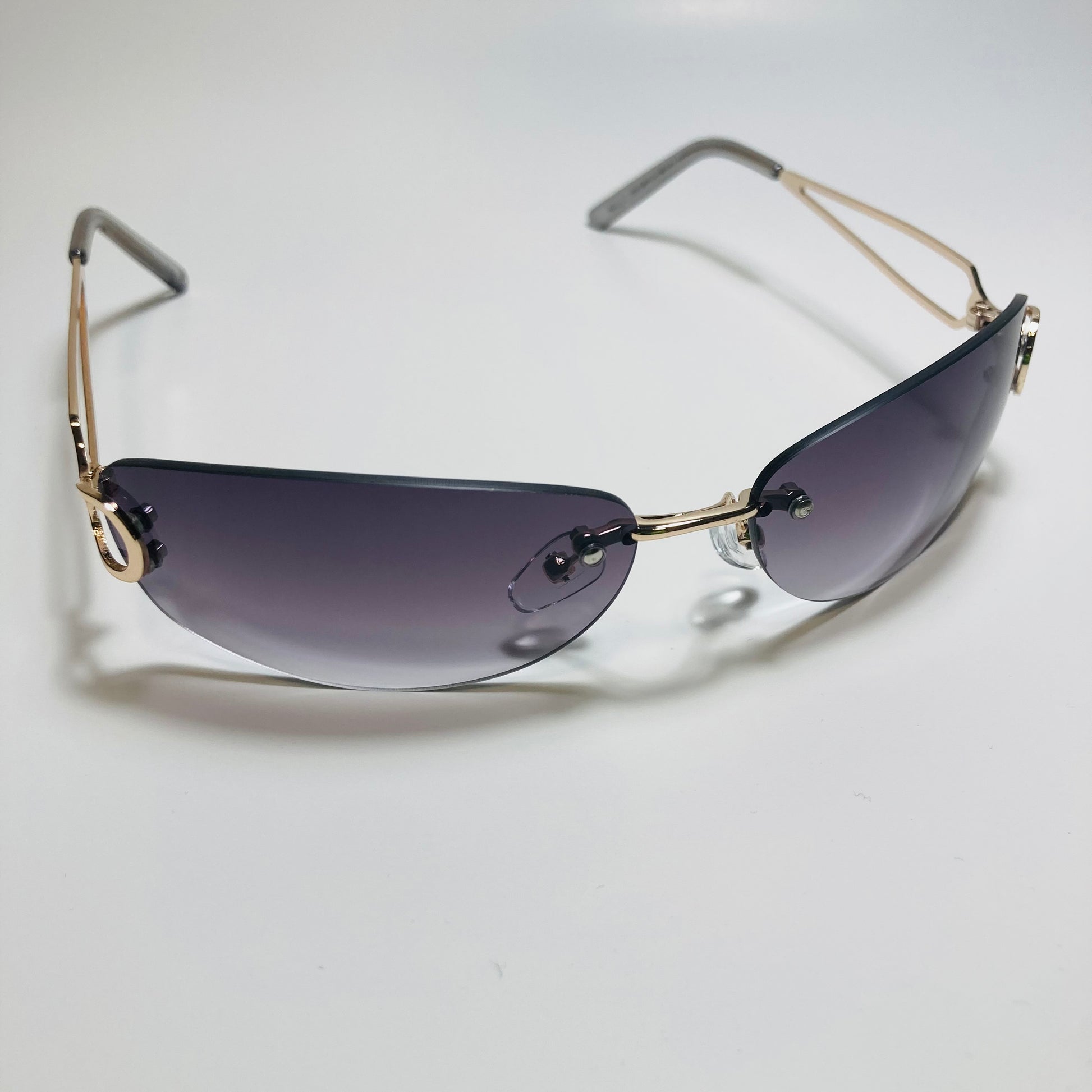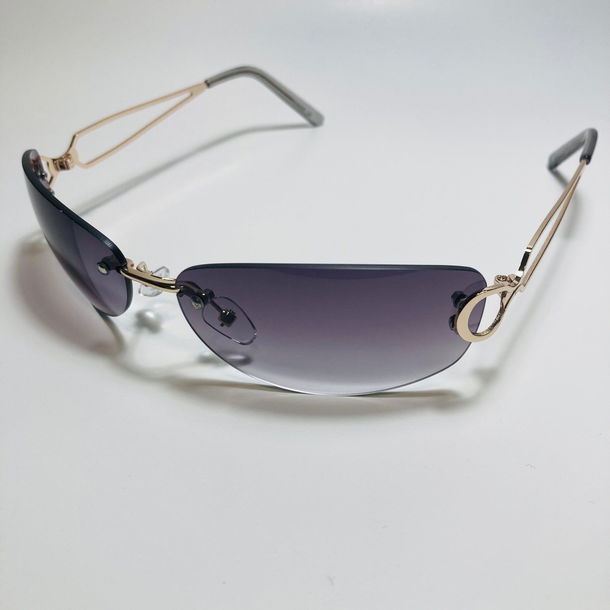 Introducing The Reed: the ultimate "throwback" accessory! These rimless, wrap, Y2K sunglasses feature a metal frame and retro styling. Available in five bold colors. Whether you're hitting the beach or strolling through the city, The Reed will add a touch of nostalgia and style to any outfit. Available in: Gold/Black, Gold/Blue, Gold/Pink, Gold/Purple, and Gold/Gray.