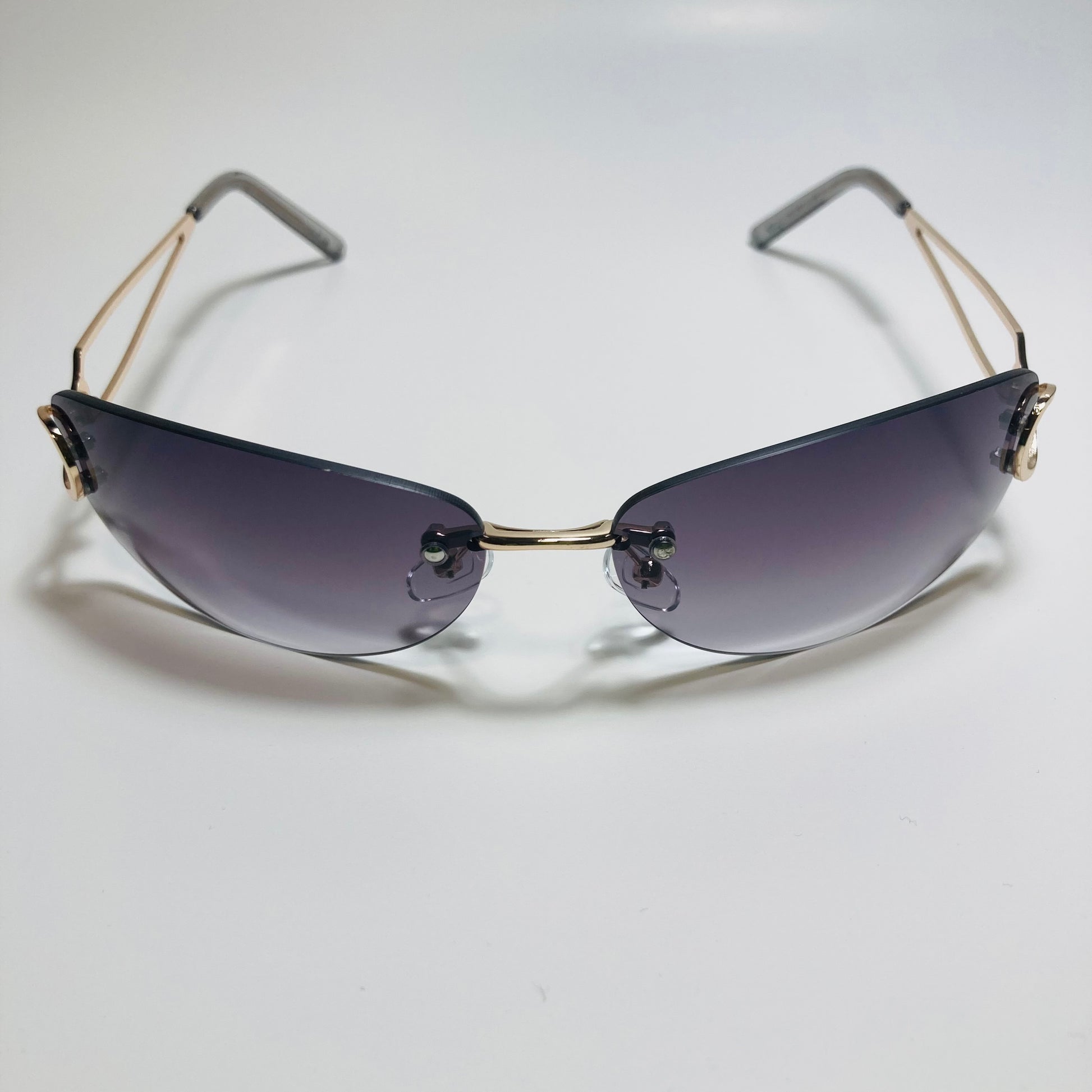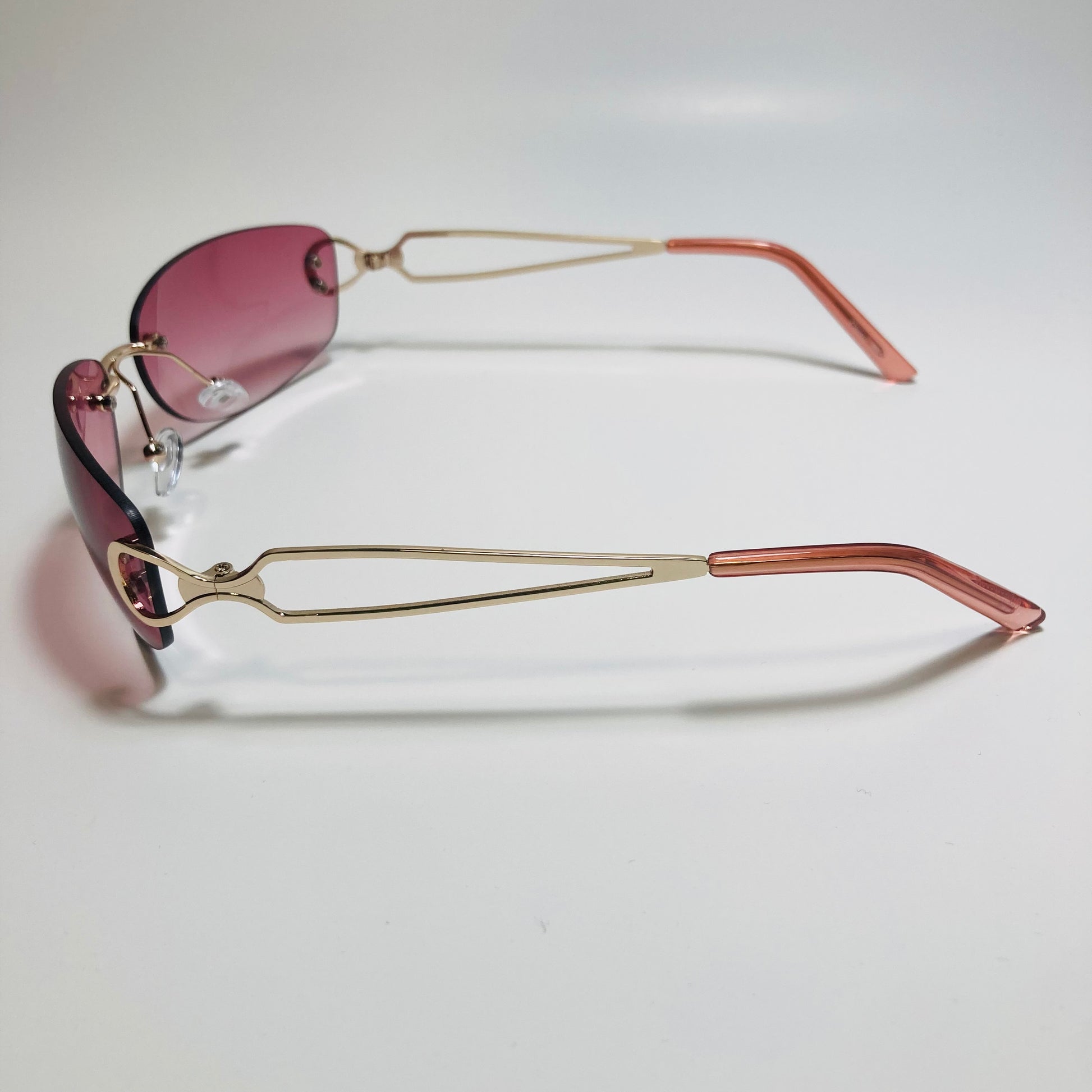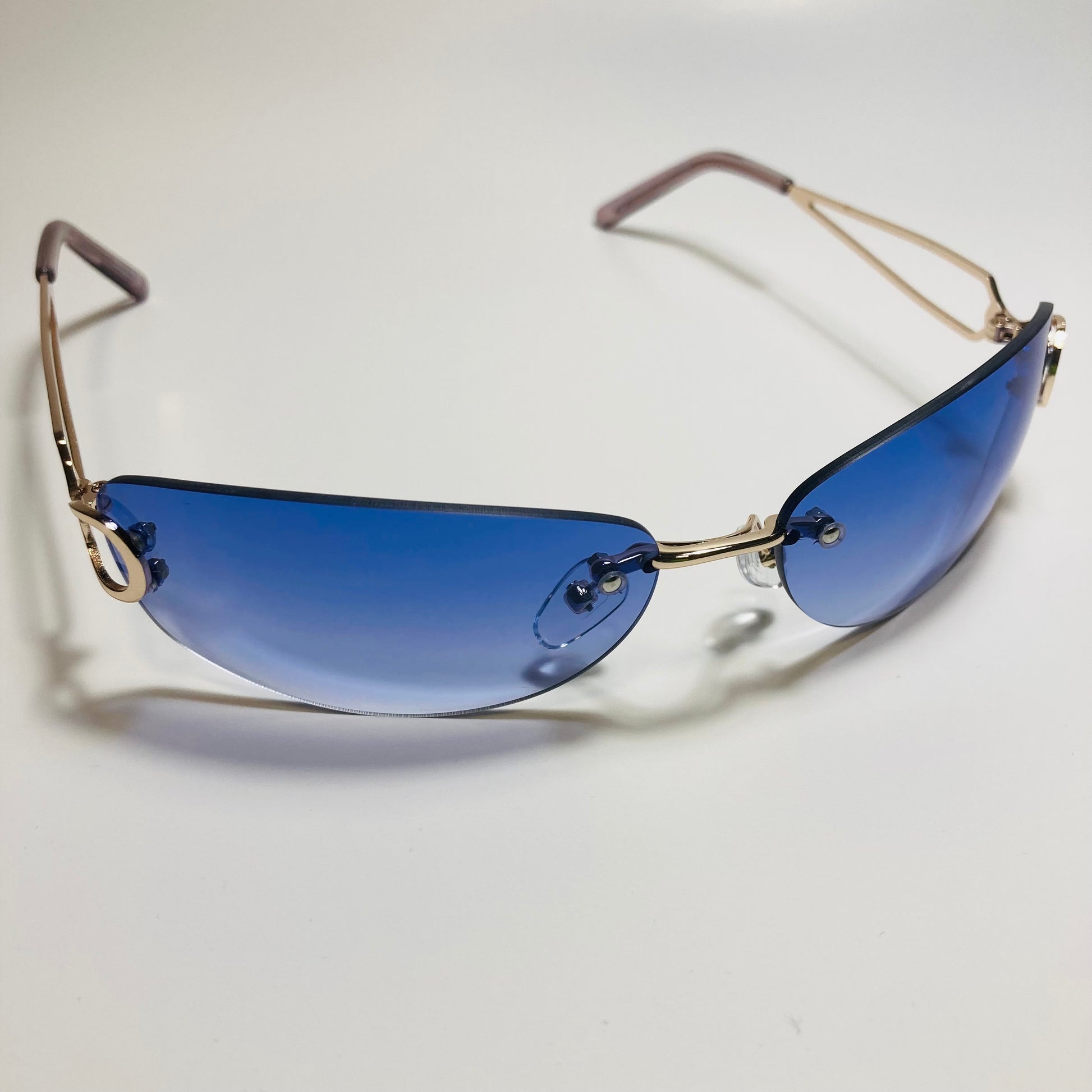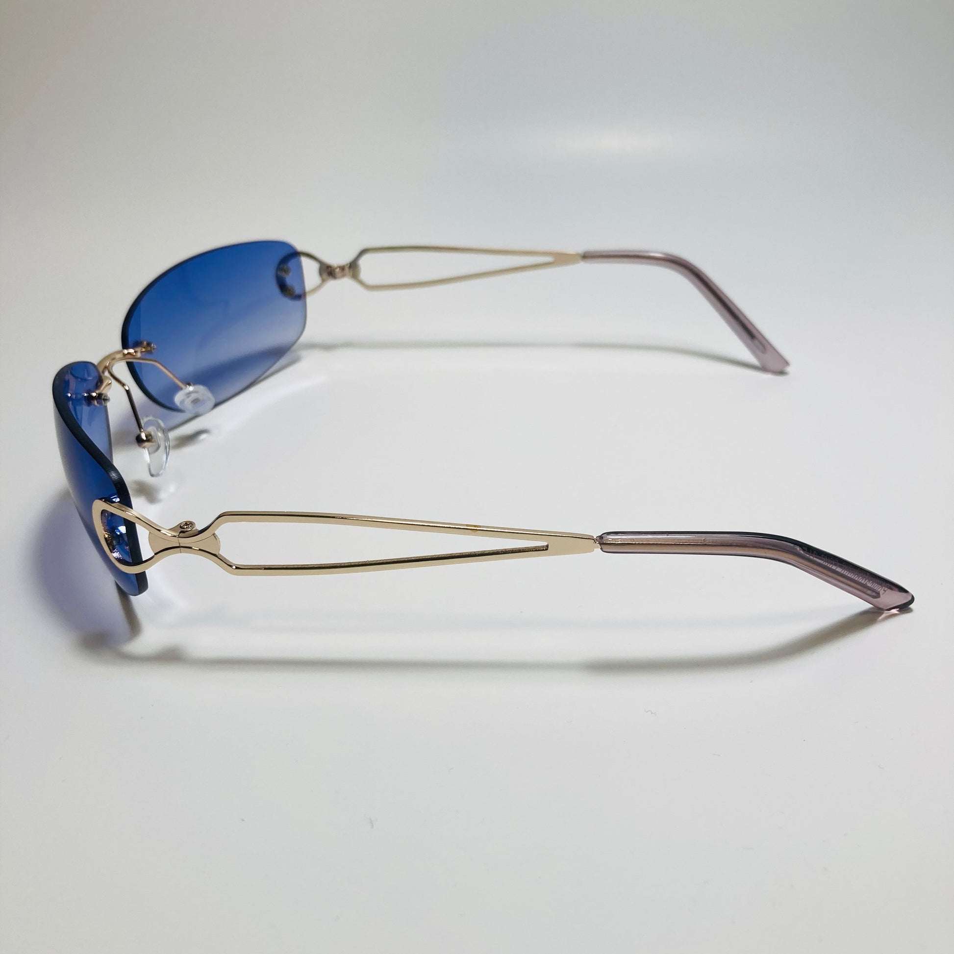 Introducing The Reed: the ultimate "throwback" accessory! These rimless, wrap, Y2K sunglasses feature a metal frame and retro styling. Available in five bold colors. Whether you're hitting the beach or strolling through the city, The Reed will add a touch of nostalgia and style to any outfit. Available in: Gold/Black, Gold/Blue, Gold/Pink, Gold/Purple, and Gold/Gray.