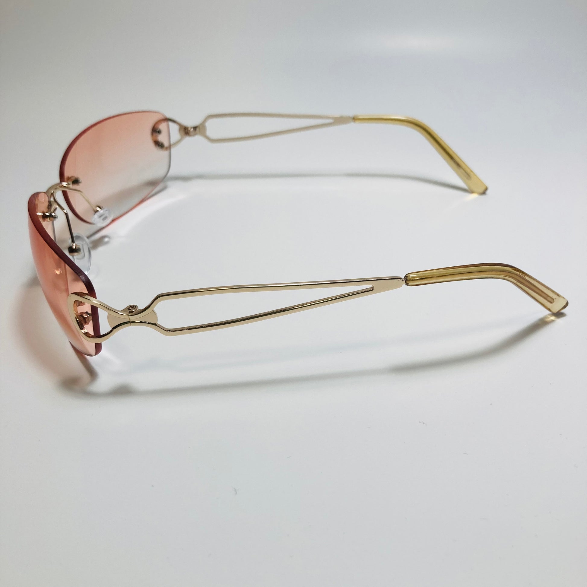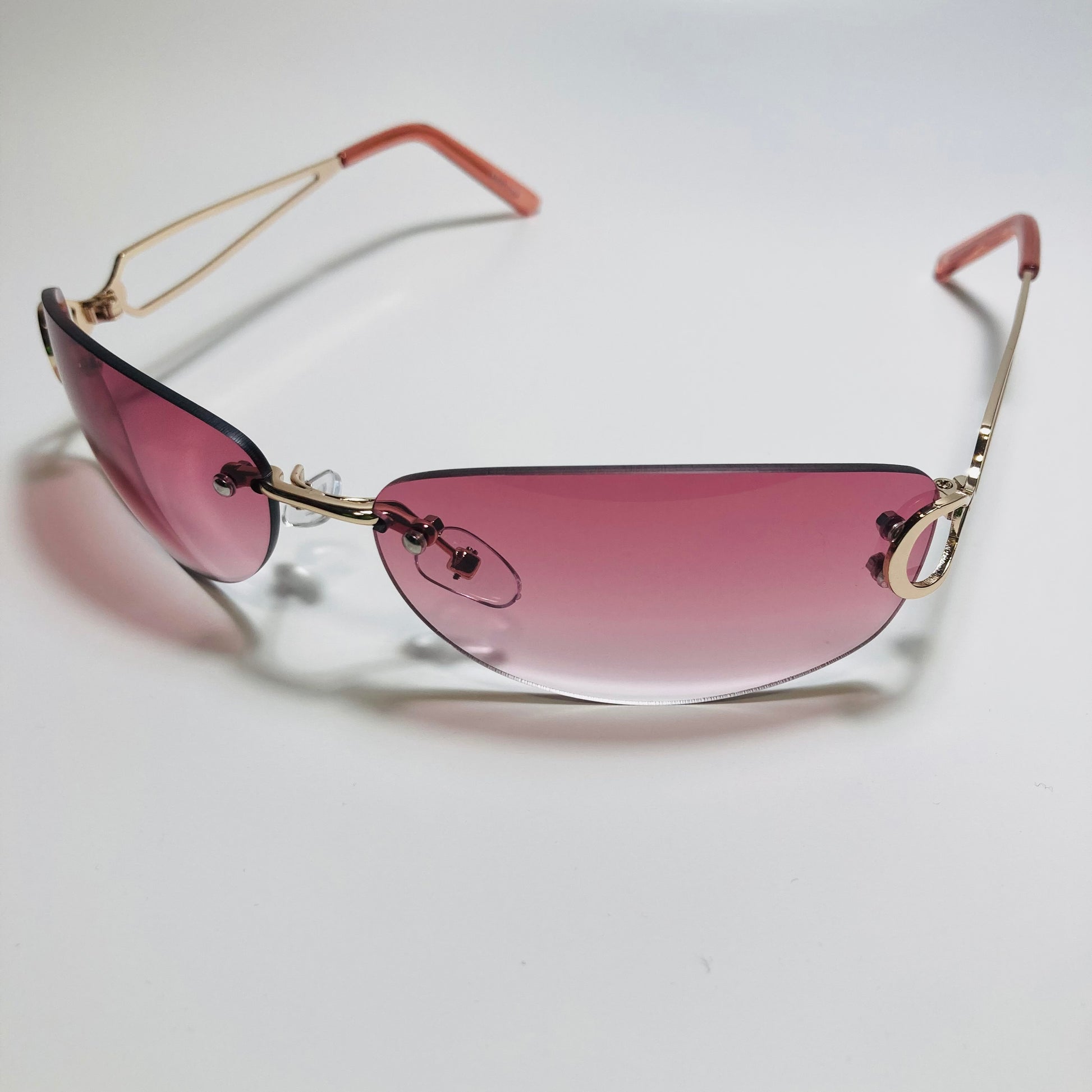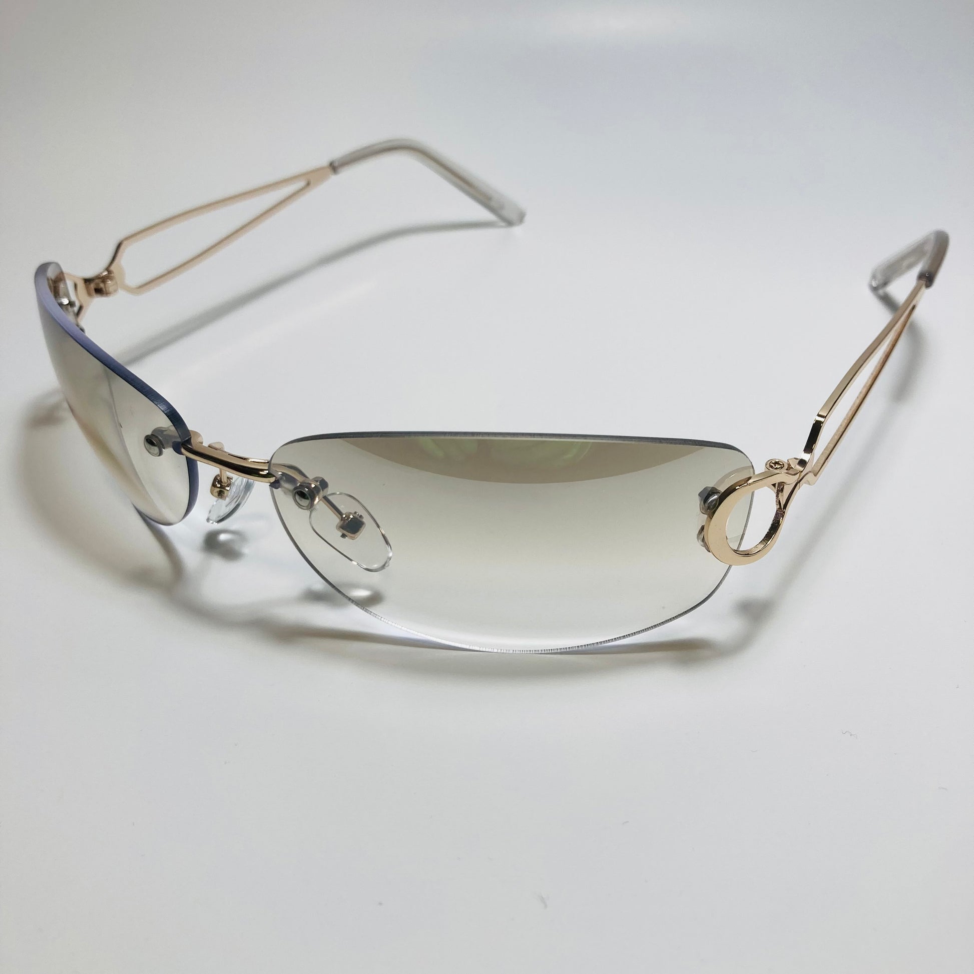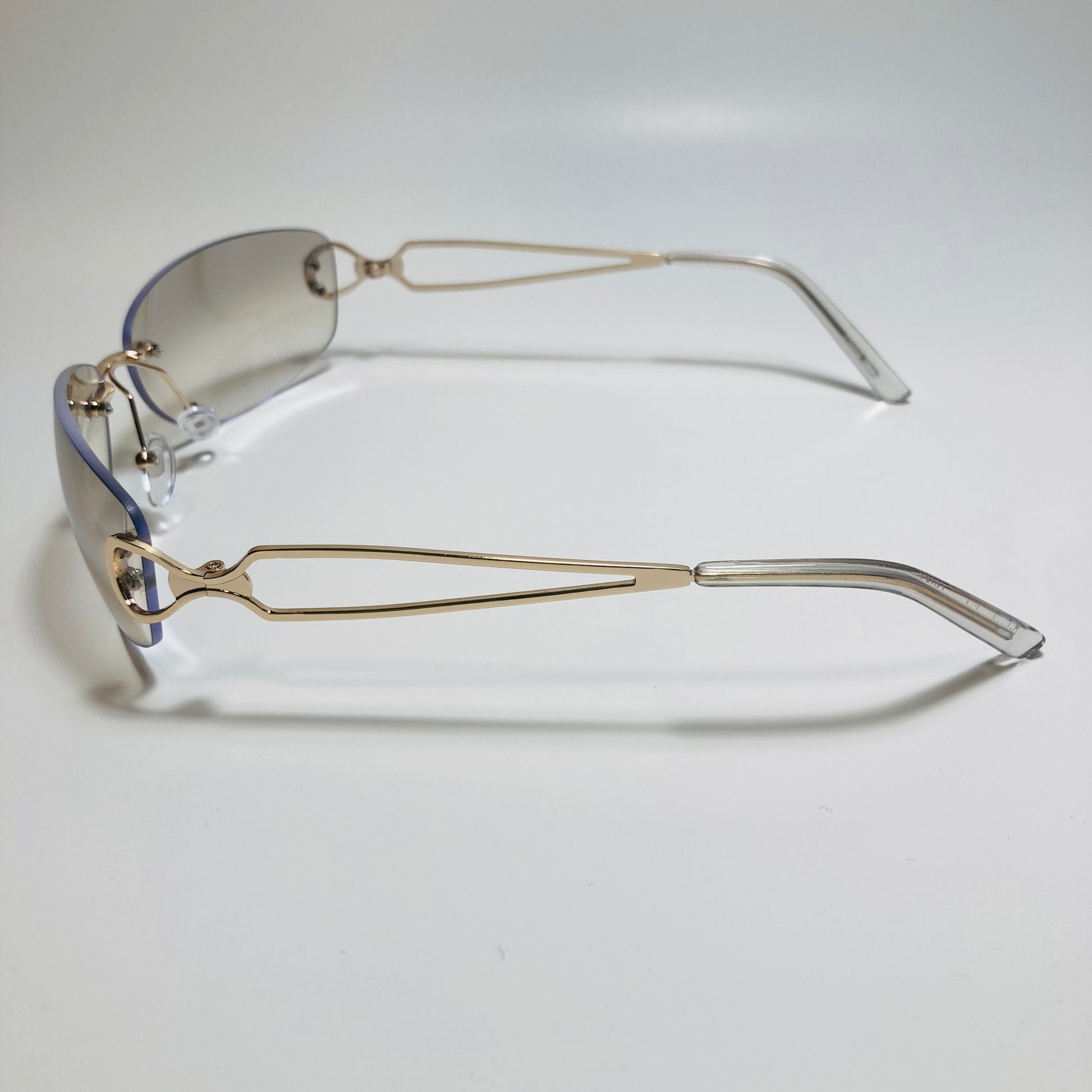 Introducing The Reed: the ultimate "throwback" accessory! These rimless, wrap, Y2K sunglasses feature a metal frame and retro styling. Available in five bold colors. Whether you're hitting the beach or strolling through the city, The Reed will add a touch of nostalgia and style to any outfit. Available in: Gold/Black, Gold/Blue, Gold/Pink, Gold/Purple, and Gold/Gray.